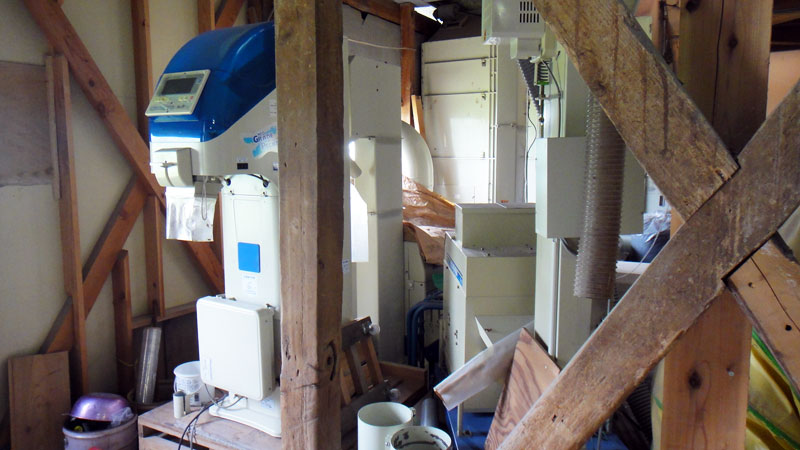 乾燥機、粗選機、籾すり機、石抜き機、選別計量機、色彩選別機。稲刈り後、籾からきれいな玄米になるまでにたくさんの機械を使用します。