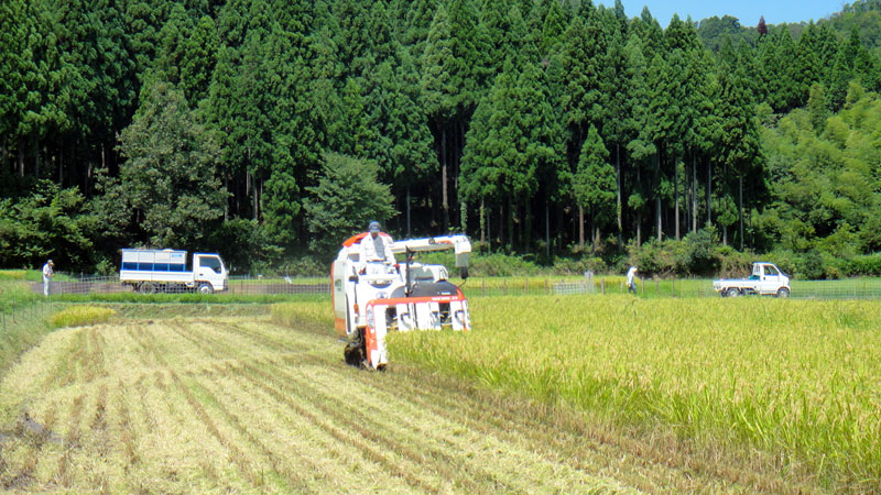 田んぼの周囲から長方形を描くように刈っていきます。田植えをするのと同じくらい時間がかかりますが、田んぼが良く乾いているで刈りやすいです。