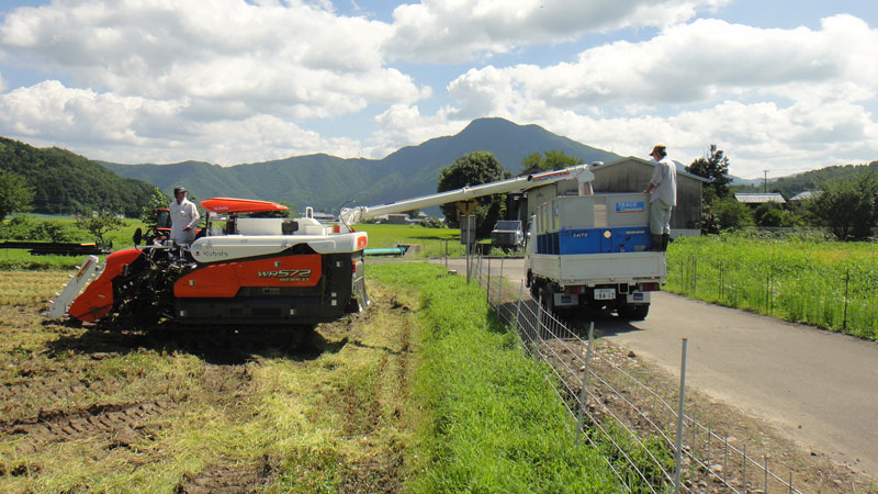 稲刈り機の籾がいっぱいになったら、コンテナに入れて乾燥施設に運びます。