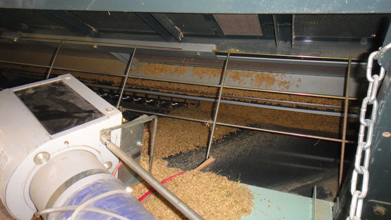 乾燥が終わった籾を摺って玄米にします。まず、雑草の種やワラゴミを取り除く機械にかけて籾をきれいにします。
