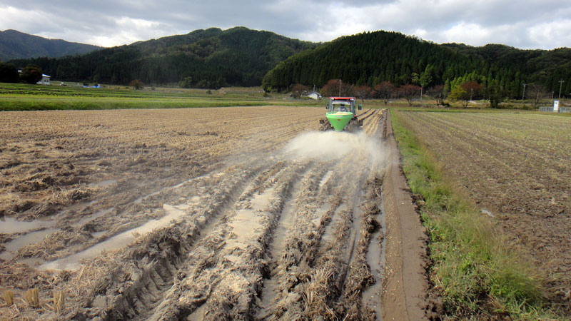 また、米ぬかや貝化石、くん炭など秋資材を散布して来年度の土作りをします。
