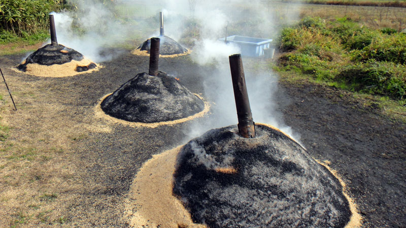 大量のモミ殻は捨ててしまうのではなく、炭にして田んぼに戻してやります。今作っているのは来年の秋にまく用のものです。