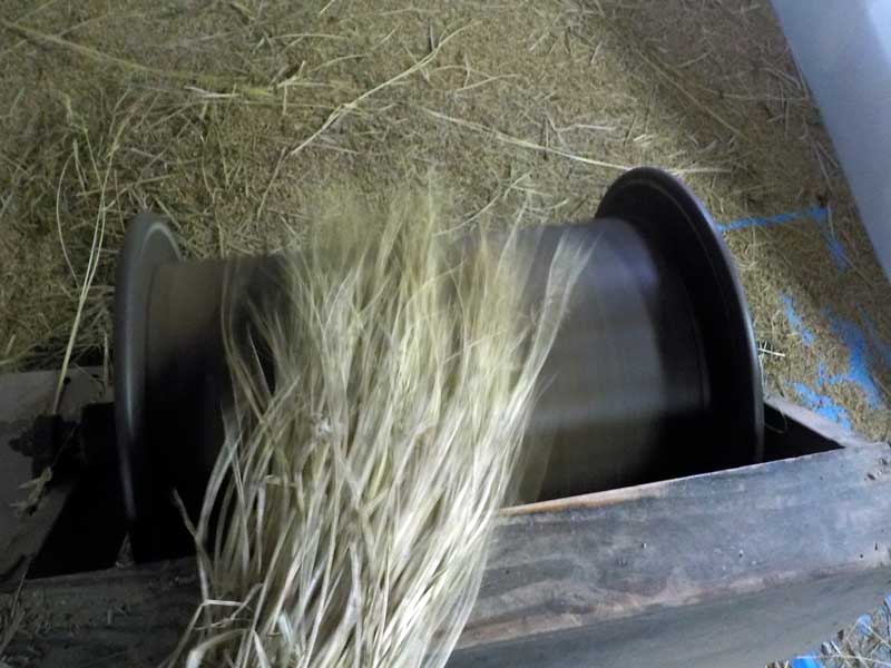 11月になっても古代米の収穫後の作業が続きます。乾燥の終わった籾を穂から外す脱穀作業を人力で行います。針金の付いたドラムを回転させ、それに穂を当てて針金に引っ掛けるようにして籾を外していきます。けっこう勢いよく飛び散るので、集めるのがたいへんでした。
