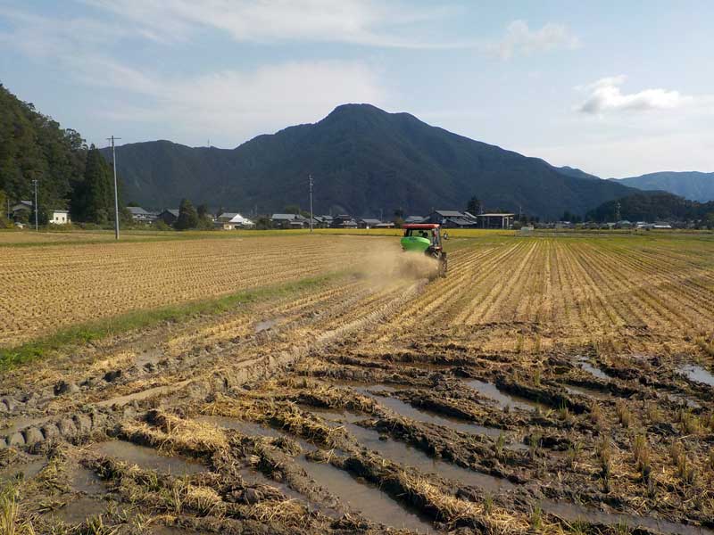 まずは米ぬか、貝化石、くん炭などの秋肥を散布し、翌年の土づくりを始めます。特に有機栽培の田んぼはこれをやっておかないと土が弱ったままになってしまうので必ずやります。田んぼに肥料を散布し、微生物がこれを餌にして活動し、小さな生き物が豊富な土壌にかわっていきます。