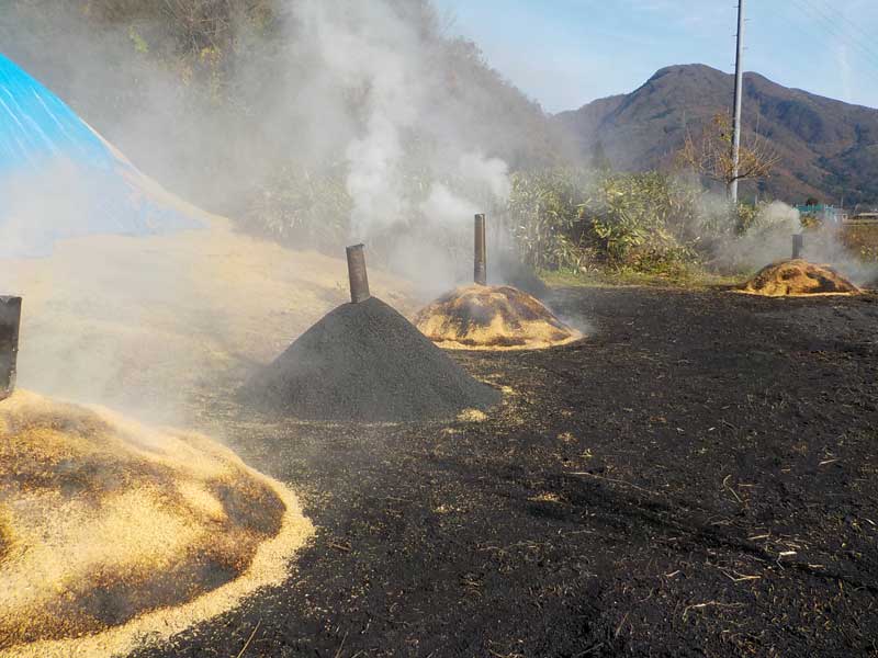燻炭作り。籾すりで出た大量の籾殻は燃やしてしまわずに炭にして田んぼに返してやります。ケイ酸が豊富で微生物の住み処になるので、これも立派な土壌改良資材です。雪が降るまで晴れた日はほぼ毎日作ります。