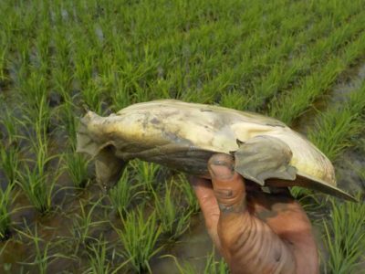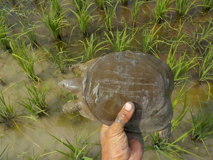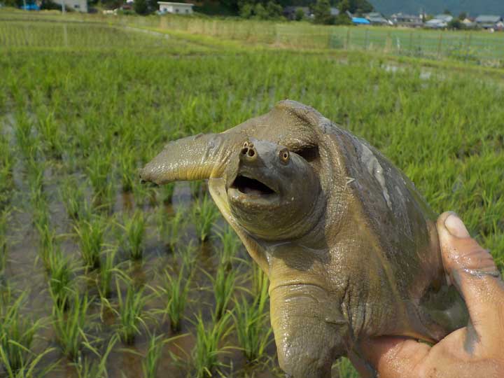 田んぼの中を歩いていると、ぬるっと動くものがいるときがあります。だいたいこういうときは亀かスッポンで、今回はスッポンでした。